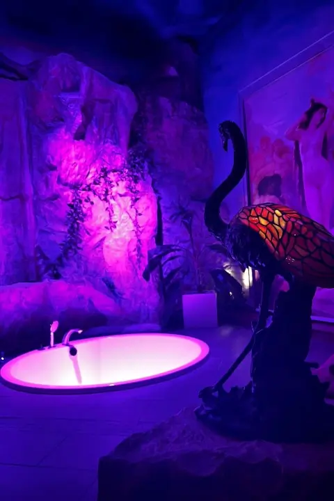 Ein integrierter Wasserfall verleiht dem Raum eine besondere, beruhigende Atmosphäre, während der kunstvoll gestaltete Sternenhimmel für ein unvergleichliches Erlebnis sorgt. Die edle Marmorbank bietet großzügigen Platz für mehrere Personen und lädt zum stilvollen Verweilen ein. In Kombination mit dem eleganten Bett und dem großzügigen Whirlpool entsteht ein exklusiver Rahmen für besondere Anlässe.